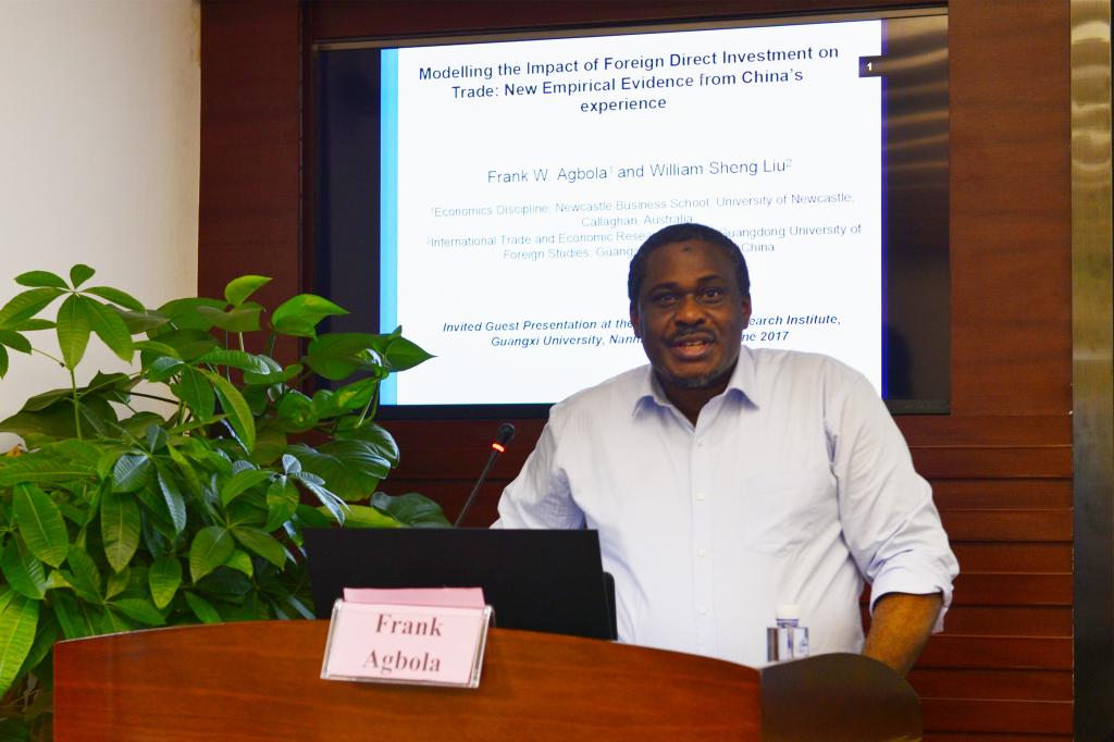 On the morning of June 23, Associate Professor Frank Agbola from University of Newcastle made an academic report named “Empirical Research on the Impacts from Foreign Direct Investment on Trade: New Evidence from China” in CARI. This report was hosted by Associate Professor Luo Chuanyu, Dean Assistant of CARI, with all teachers and students attending it.